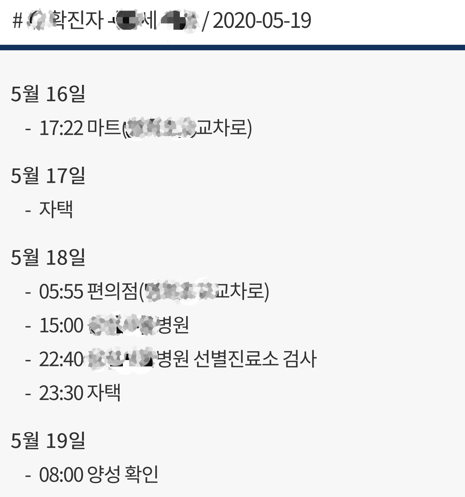 Im Falle eines positiv getesteten Patienten kann die zuständige Behörde zusätzlich zu den Aussagen der Betroffenen in Zusammenarbeit mit Polizei, Finanzinstitutionen und Telefonunternehmen digitale Informationen wie CCTV, Kartentransaktionsverlauf, Smartphone-GPS usw. auswerten. Basierend auf diesen Informationen wird der Standortverlauf der positiv getesteten Patienten in einer Zeitleiste dargestellt. Die Bewegungsdaten der Infizierten werden anonymisiert auf der Homepage der Stadt und des Bezirkssamts öffentlich zugänglich gemacht. Entsprechende Informationen werden auch per SMS (Notfallmeldung) an die Besitzer von Mobiltelefonen weitergeleitet. 14 Tage nach Ablauf des letzten sozialen Kontakts eines Infizierten werden die Informationen aus dem öffentlich zugänglichen Netz genommen.