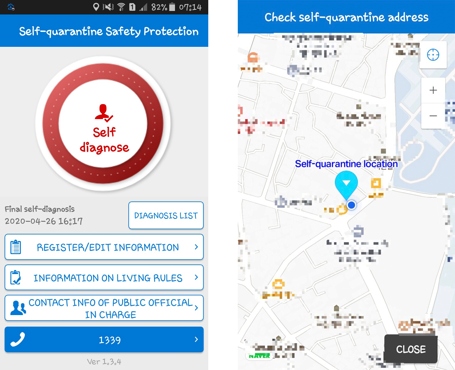 Selbstquarantäne in Korea ist eine besondere Art der Ausgangssperre. Patienten mit leichten Symptomen, Kontaktpersonen von Infizierten sowie alle aus dem Ausland Einreisenden müssen sich unabhängig von ihrer Nationalität in eine 14-tägige Quarantäne begeben. Den Betroffenen wird jeweils ein Kommunalbeamter zugeteilt. Personen in Quarantäne sind verpflichtet, zweimal pro Tag mittels der Selbstquarantäne-Applikation ihren gesundheitlichen Status an die zuständigen Beamten zu übermitteln. Zudem müssen sie ihre Smartphone-GPS stets eingeschaltet lassen, damit Beamte ihren Standort überprüfen können. Zwei Wochen lang dürfen Personen in Quarantäne ihre Wohnung nicht unerlaubt verlassen.
