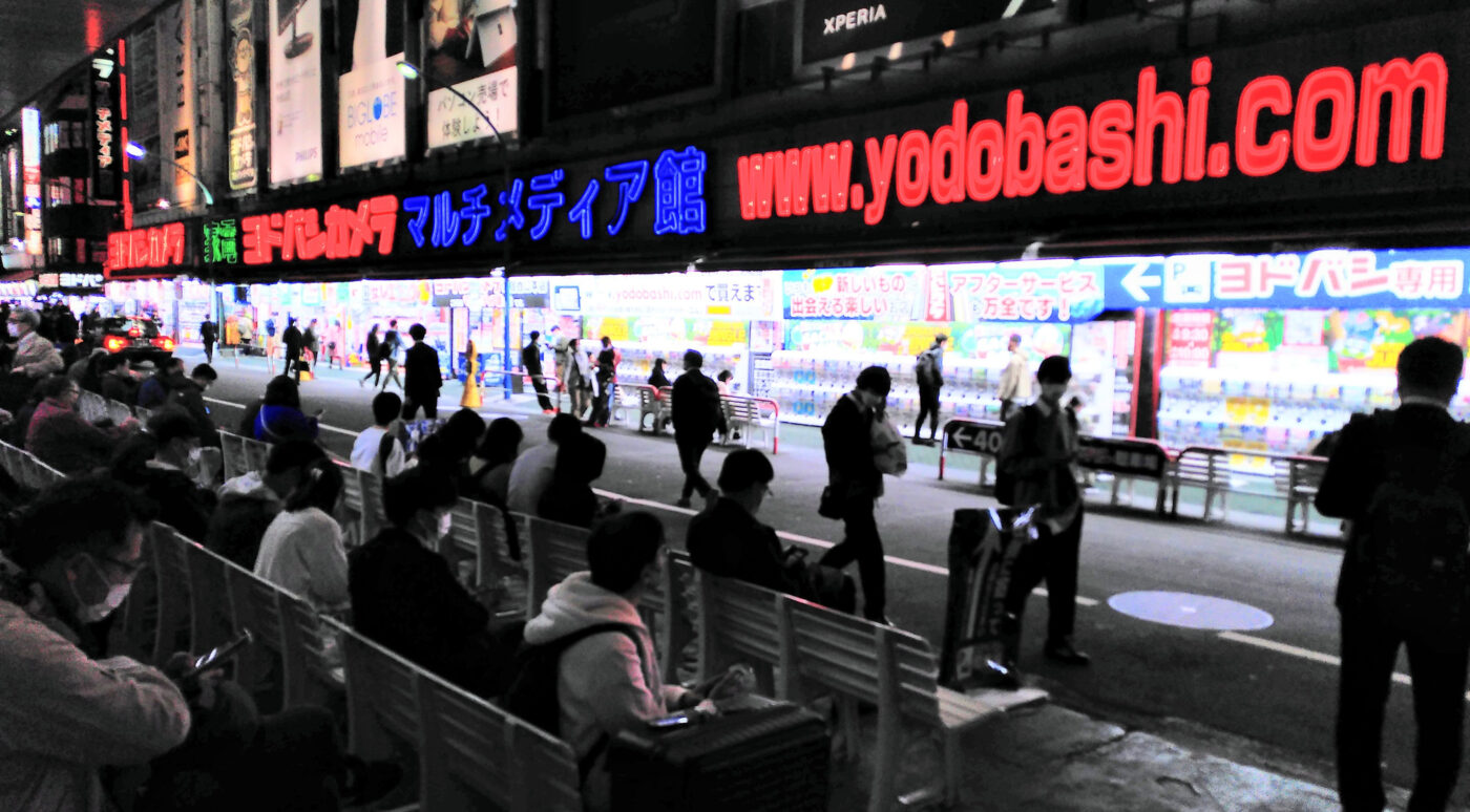 We are therefore not only conducting numerous interviews with Pokémon players in Germany, but we also traveled to Tokyo, the mecca for hybrid reality games. The smooth integration of Pokémon Go into Tokyo’s public space can be observed on the forecourt of the Yodabashi Camera electronics market. Hundreds of players regularly gather here to defeat particularly powerful Pokémons. Stickers displaying the Pokémon logo identify white benches as seating specifically intended for players. These are arranged in long rows so that the people sitting there can look in the direction of the electronics market, though in actuality they mainly look at their cell phones. Just as many passersby crowd in between and next to them, going about their business and barely noticing the players present.