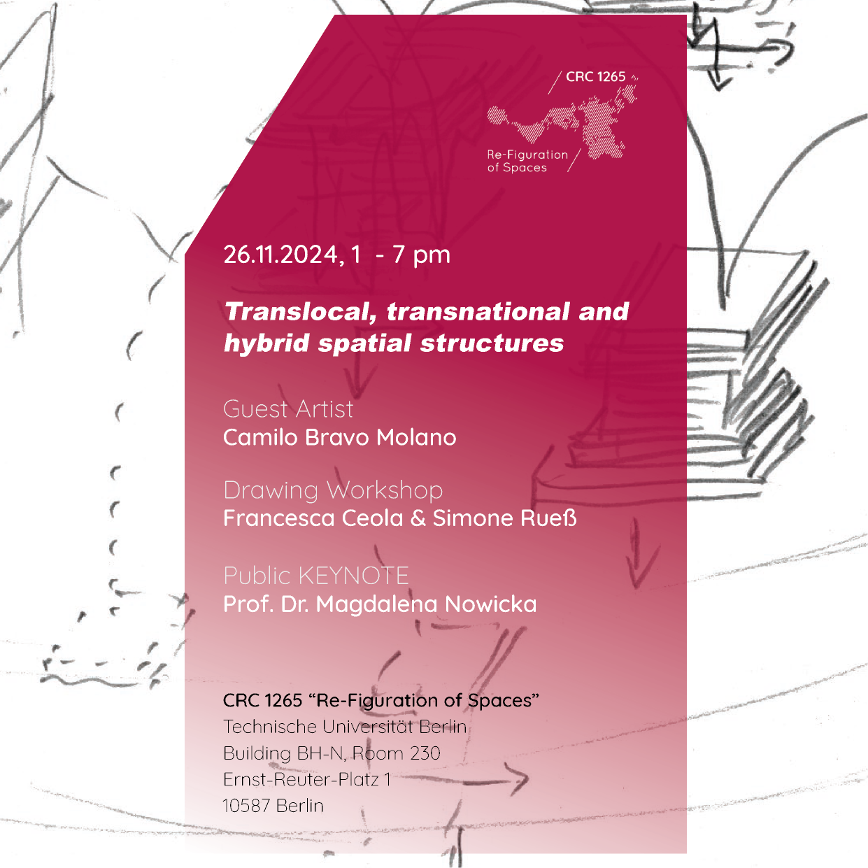 In the creative workshop „Translocal, transnational, and hybrid spatial structures“, hosted by Francesca Ceola and Simore Rueß, ideas will be shared and graphic languages will be suggested to address, reflect on, or analyse translocality, transnationalism and hybrid cultural space-oriented (or spatial) practices. It is supported by the audio-visual work of guest artist Camilo Bravo Molano. The workshop closes with the public keynote lecture by sociologist Prof. Dr. Magdalena Nowicka (https://visionproject.net) at 6 pm, who will discuss insights from her research on migration, mobility, transnational processes and convivial society. The Workshop is going to be held in English, and is addressed to all transdisciplinary spatial scholars. We ask interested participants to register in advance until 30th of October 2024 by sending an email to francesca.ceola@tu-berlin.de.